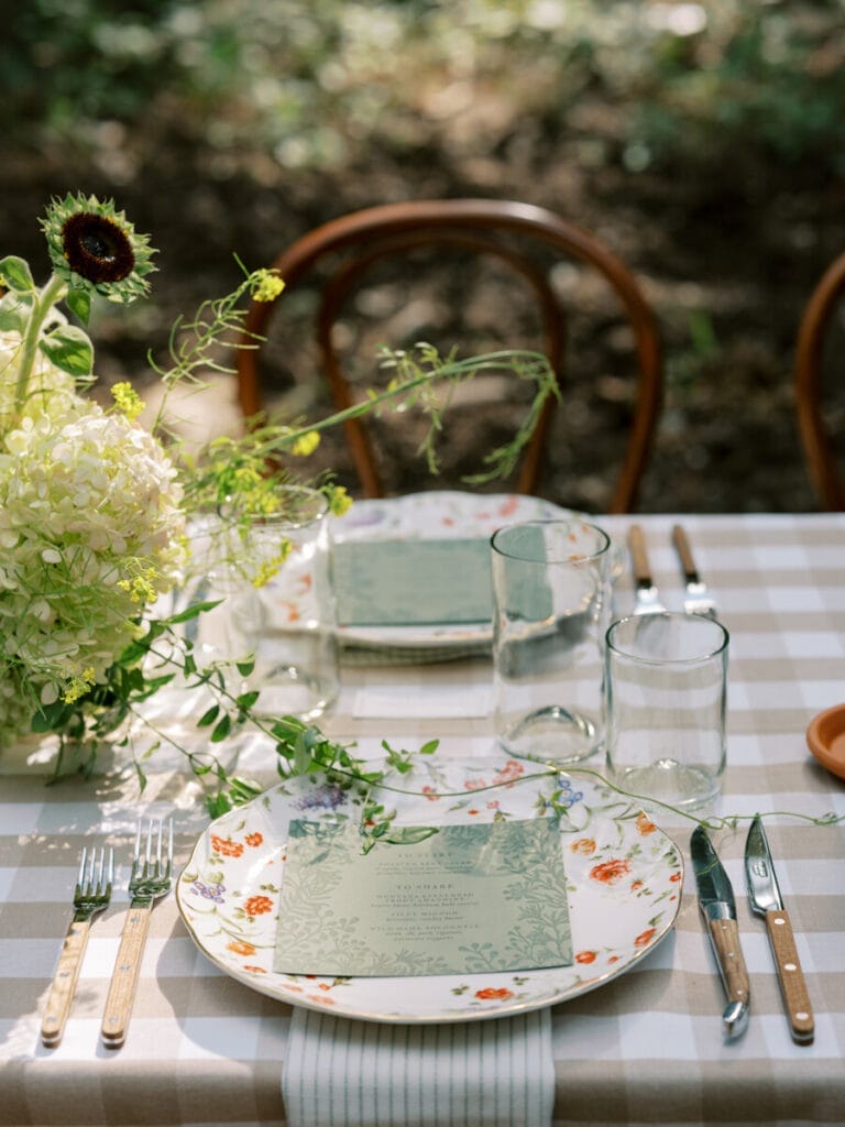 Soft green menus echoed the tones of the forest, while clear glassware and understated candles kept the tablescape feeling light and effortless.