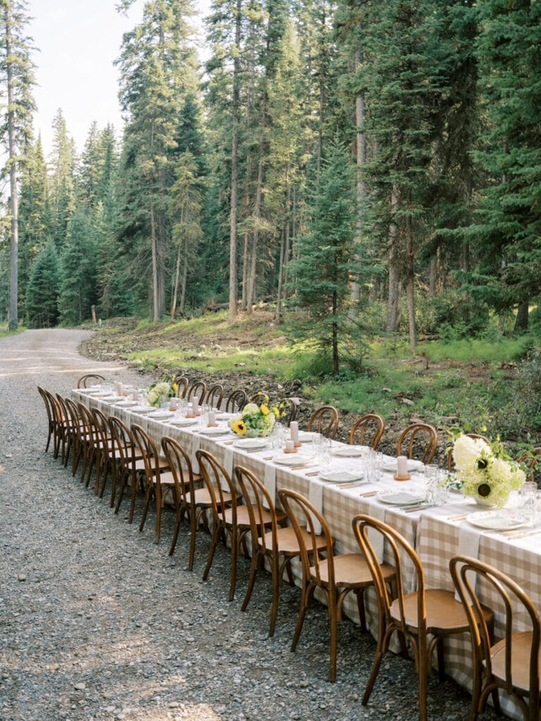 Nestled along a quiet forest road, this dinner embraced Montana’s natural beauty in the most effortless way. A winding gravel path led guests to a stunning tablescape that felt like an extension of the landscape itself. Surrounded by evergreens and soft afternoon light, the setting felt intimate yet expansive – the kind of place where time slows down and conversations linger.