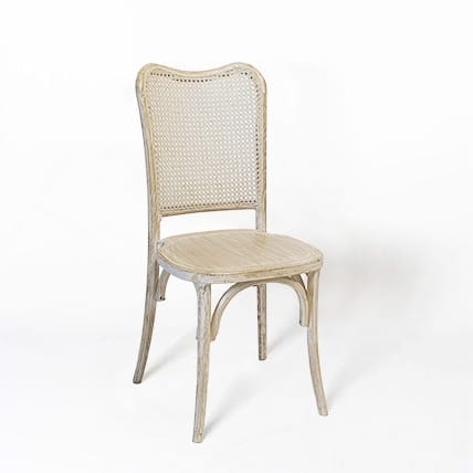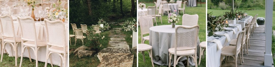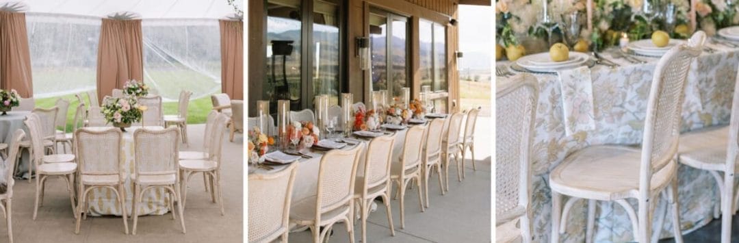 With a whitewashed wood finish and a delicate cane back, the Presley Chair effortlessly marries vintage sophistication with modern ease. Its clean lines and neutral tones make it an incredibly flexible option, adapting to a variety of design styles. Whether you’re planning an outdoor garden party bursting with florals, an indoor candlelit reception with classic table settings, or a mountaintop ceremony surrounded by Montana’s natural beauty, the Presley Chair blends in while still making a statement.